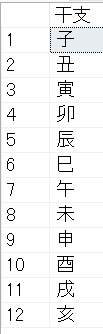 SELECT value AS 干支 from string_split('子,丑,寅,卯,辰,巳,午,未,申,酉,戌,亥', ',');これを実行すると、以下のようにカンマ区切りで文字列を分割して行ごとに格納してくれます。