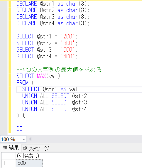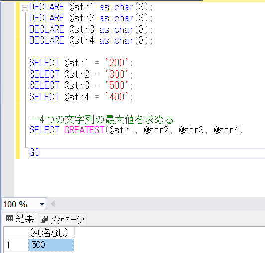 @str3に設定した値である500が最も大きいため、結果が500と返ってきたのが確認できます。